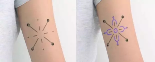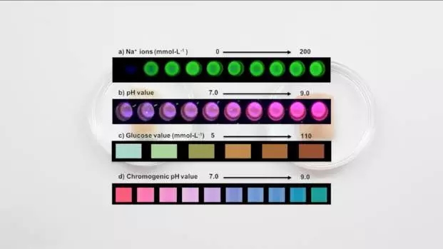 Ŀǰ£¬ÎÆÉí¿ÉÒÔͨ¹ý¸Ä±äÑÕÉ«£¬·´Ó³ÌåÒºÖÐѪÌÇ¡¢ÄɺÍPHÖµµÄ±ä»¯£ºPH´«¸ÐÆ÷ÄÜ´Ó×ÏÉ«±ä³É·ÛÉ«£¬ÆÏÌÑÌÇ´«¸ÐÆ÷ÄÜ´ÓÀ¶É«±ä³Éרɫ£¬ÄÉÄÜÔÚUV¹âÏ·¢³öÓ«¹âµÈµÈ¡£